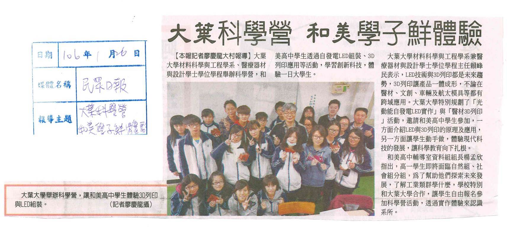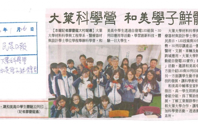 大葉科學營 和美學子鮮體驗 106.01.26 民眾日報報導