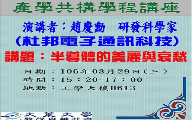 演講內容:講述半導體的發展,瓶頸與未來,供學子們對未來職涯規劃,及對我國半導體技術的發展有基礎的認識。 參加對象:材料系大一至大四同學