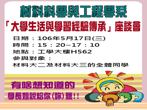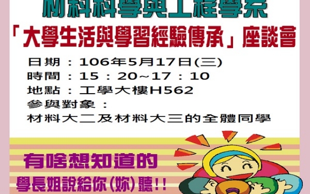[活動]5/17(三)15:20H562材料系大學生活與經驗分享座談會