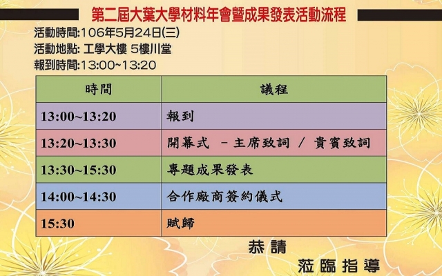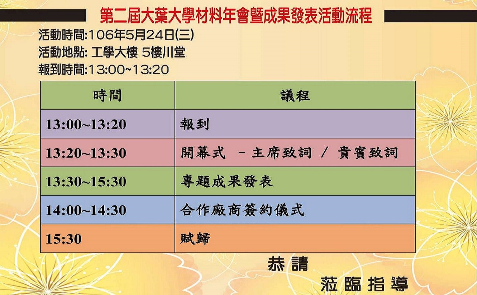 [活動]敬邀參加5/24(三)105學年度第二屆大葉大學材料年會暨成果發表會