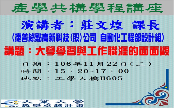 [活動]106-1產學共構專題演講-11/22邀請莊文煌課長(捷普綠點高新科技(股)公司)蒞臨