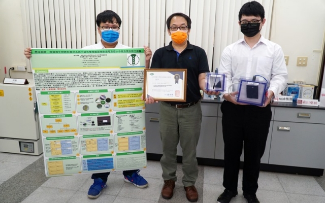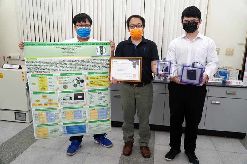 獲頒佳作的「懸浮細菌-微藻微生物燃料電池系統中碳布電極截面積對產電及廢水中碳及氮去除之影響」,由吳建一老師指導大三生楊承諭、林峻葦完成。楊承諭同學說,細菌-微藻微生物燃料電池是生物電化學裝置,陽極槽、陰極槽中間有交換膜,透過微生物進行厭氧作用,把廢水中的有機物轉化為電能,他們經過實驗找出當電極使用碳布時,發電與汙水處理效益最好的電極截面積,提高生物燃料電池產品化的可行性。