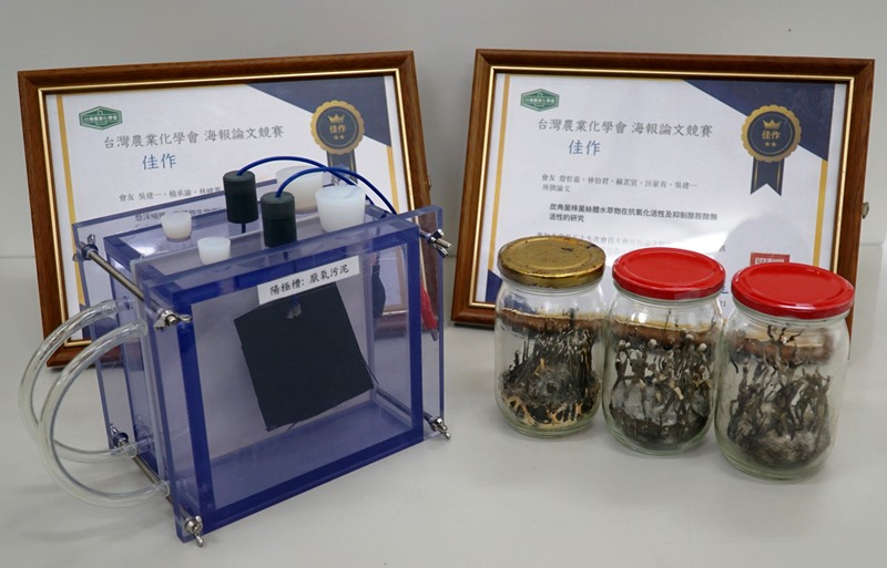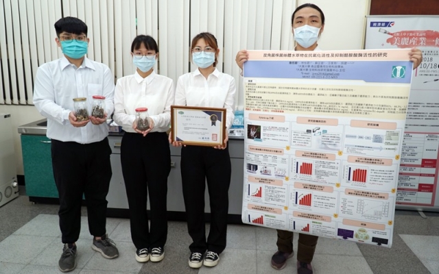 同樣獲頒佳作的「炭角菌株菌絲體水萃物在抗氧化活性及抑制酪胺酸(酉每)活性的研究」,由吳建一老師指導碩士生詹哲嘉、汪家有、大三生林怡君、蘇芷宣完成。林怡君同學指出,他們採集生長在白蟻窩的真菌,人工培養後篩選出炭角菌株,進一步研究萃取物的成分含量、抗氧化活性,以及抑制酪胺酸(酉每)活性,實驗證實具有應用於食品及美粧的潛力。