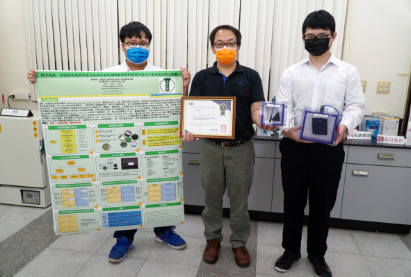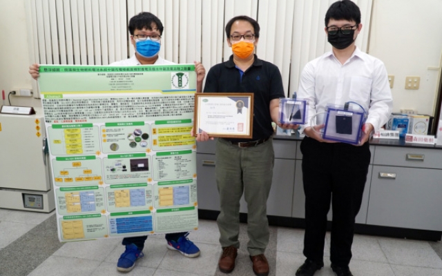 獲頒佳作的「懸浮細菌-微藻微生物燃料電池系統中碳布電極截面積對產電及廢水中碳及氮去除之影響」,由吳建一老師指導大三生楊承諭、林峻葦完成。楊承諭同學說,細菌-微藻微生物燃料電池是生物電化學裝置,陽極槽、陰極槽中間有交換膜,透過微生物進行厭氧作用,把廢水中的有機物轉化為電能,他們經過實驗找出當電極使用碳布時,發電與汙水處理效益最好的電極截面積,提高生物燃料電池產品化的可行性。