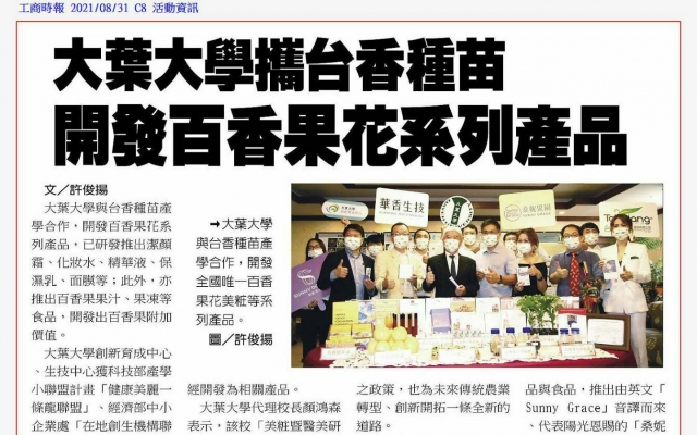 大葉大學代理校長顏鴻森表示,該校「美粧暨醫美研發基地」具有最完善的設備及研究能量,提供在地企業從測試、研發到行銷包裝一條龍服務,開創產學雙贏。此次與台香種苗合作,不只是讓原本種苗製程中的農業廢棄物有新的利用,更提升了百香果附加價值,充分實踐政府循環經濟、永續農業之政策,也為未來傳統農業轉型、創新開拓一條全新的道路。