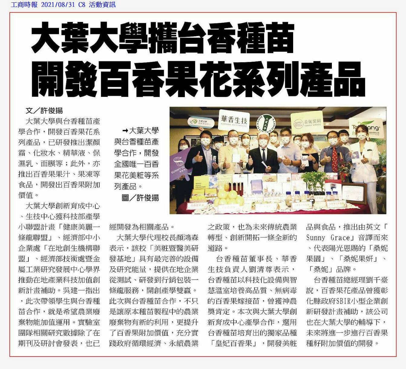 台香種苗董事長、華香生技負責人劉清尊表示,台香種苗以科技化設備與智慧溫室培養高品質、無病毒的百香果嫁接苗,曾獲神農獎肯定。本次與大葉大學創新育成中心產學合作,選用台香種苗培育出的獨家品種「皇妃百香果」,開發美粧品與食品,推出由英文「Sunny Grace」音譯而來、代表陽光恩賜的「桑妮果園」、「桑妮果妍」、「桑妮」品牌。