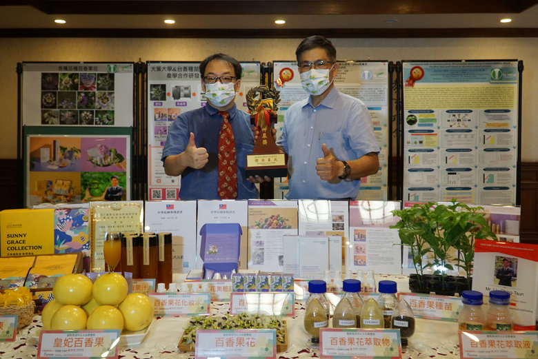 大葉大學創新育成中心、生技中心陸續獲得科技部產學小聯盟計畫「健康美麗一條龍聯盟」、中小企業處「在地創生機構聯盟」與經濟部技術處暨金屬工業研究發展中心學界推動在地產業科技加值創新計畫補助,由大葉大學創新育成中心主任、生技中心主任吳建一帶領食科系學生團隊,與台香種苗公司產學合作,主要以萃取百香果花朵為美妝原料,發展出化妝水、精華液等美妝品,進而研發出百香果果汁與果凍等食品,把百香果價值發揮極致。