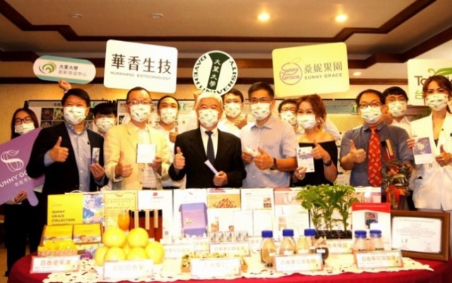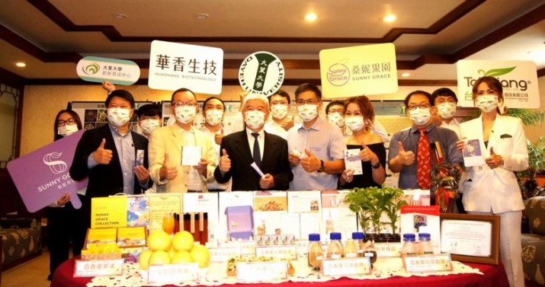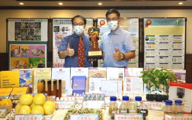 大葉大學創新育成中心、生技中心獲科技部產學小聯盟計畫「健康美麗一條龍聯盟」、經濟部中小企業處「在地創生機構聯盟」、經濟部技術處暨金屬工業研究發展中心學界推動在地產業科技加值創新計畫補助,吳建一主任帶領食品暨應用生物科技學系博士生胡峻儒、碩士生詹哲嘉、江育昌、汪家有、黃振凱、大四生楊雯茹與台香種苗股份有限公司產學合作。吳建一指出,百香果是營養成分豐富的水果,在種苗培育過程會從果實挖取種籽出來育苗,果肉因此成為農業廢棄物,百香果開花階段也會為了疏果,剪下大量花朵,這些廢棄物不是用於堆肥就是直接丟棄,相當可惜。此次與台香種苗合作,就是希望農業廢棄物能加值運用。實驗室團隊先將百香果花朵乾燥,測試不同部位的成分與機能,並比較各種萃取製程的效果,相關研究數據除了在期刊及研討會發表,也已經開發為美粧品,是市面唯一的百香果花美粧產品。同時將皇妃百香果製作為不添加防腐劑、香料、色素的百香果濃縮果汁、百香優果凍,經過感官品評選出最適口感與配方,相關產品都已上市。