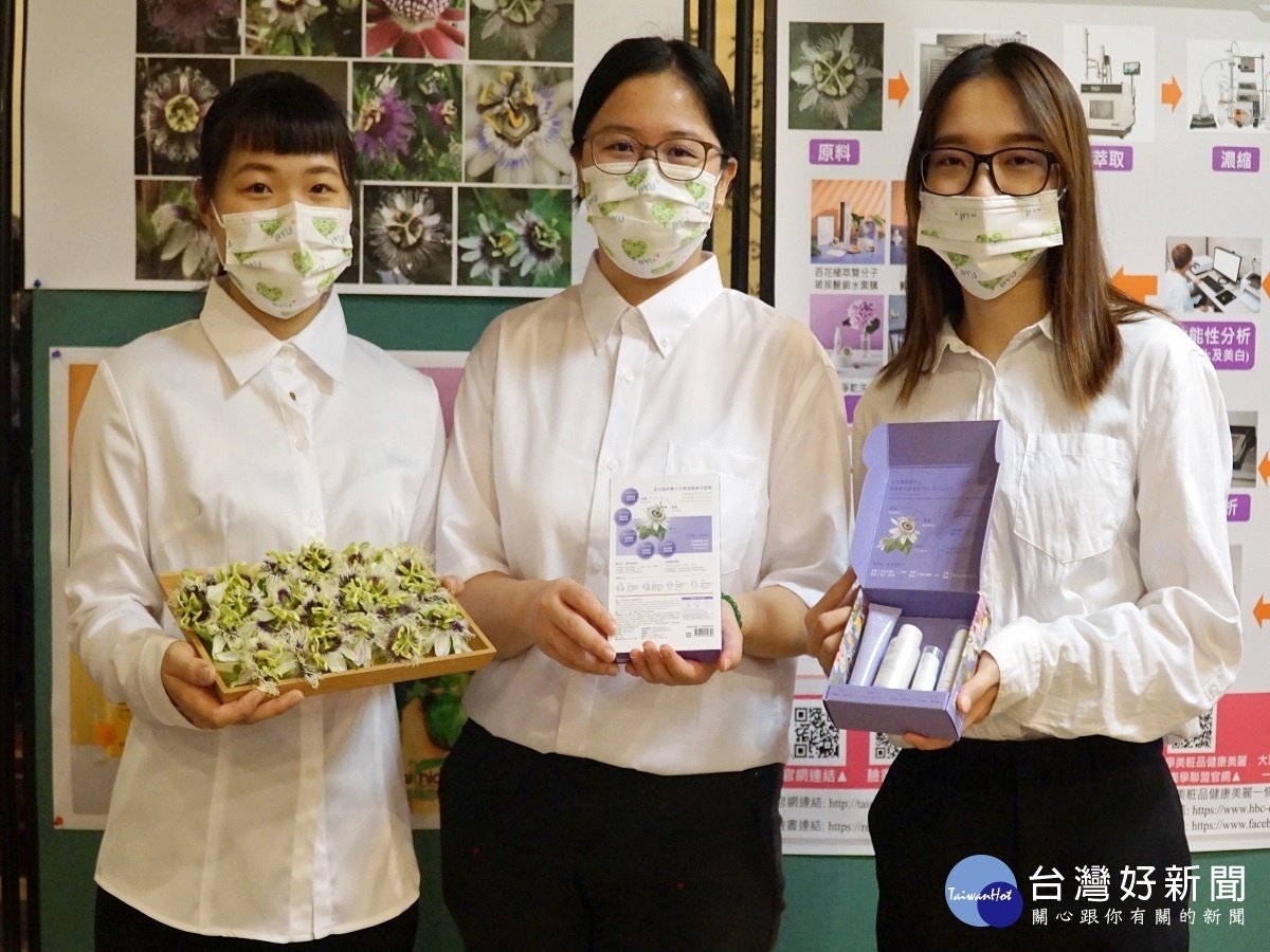 大葉創新育成中心主任吳建一指出,百香果是營養成分豐富的水果,在種苗培育過程會從果實挖取種籽出來育苗,果肉因此成為農業廢棄物,百香果開花階段也會為了疏果,剪下大量花朵,這些廢棄物不是用於堆肥就是直接丟棄,相當可惜,此次台香種苗尋求學校合作,就是希望農業廢棄物能加值運用。實驗室團隊先將百香果花朵乾燥,測試不同部位的成分與機能,並比較各種萃取製程的效果,證實百香果花萃取物具備抗氧化、美白特性,相關研究數據除了在期刊及研討會發表,也已經開發為美粧品,是市面是唯一的百香果花美粧產品。同時將皇妃百香果製作為不添加防腐劑、香料、色素的百香果濃縮果汁、百香優果凍,經過感官品評選出最適口感與配方,相關產品都已上市。