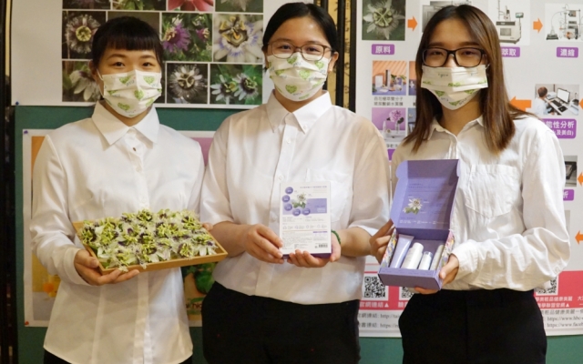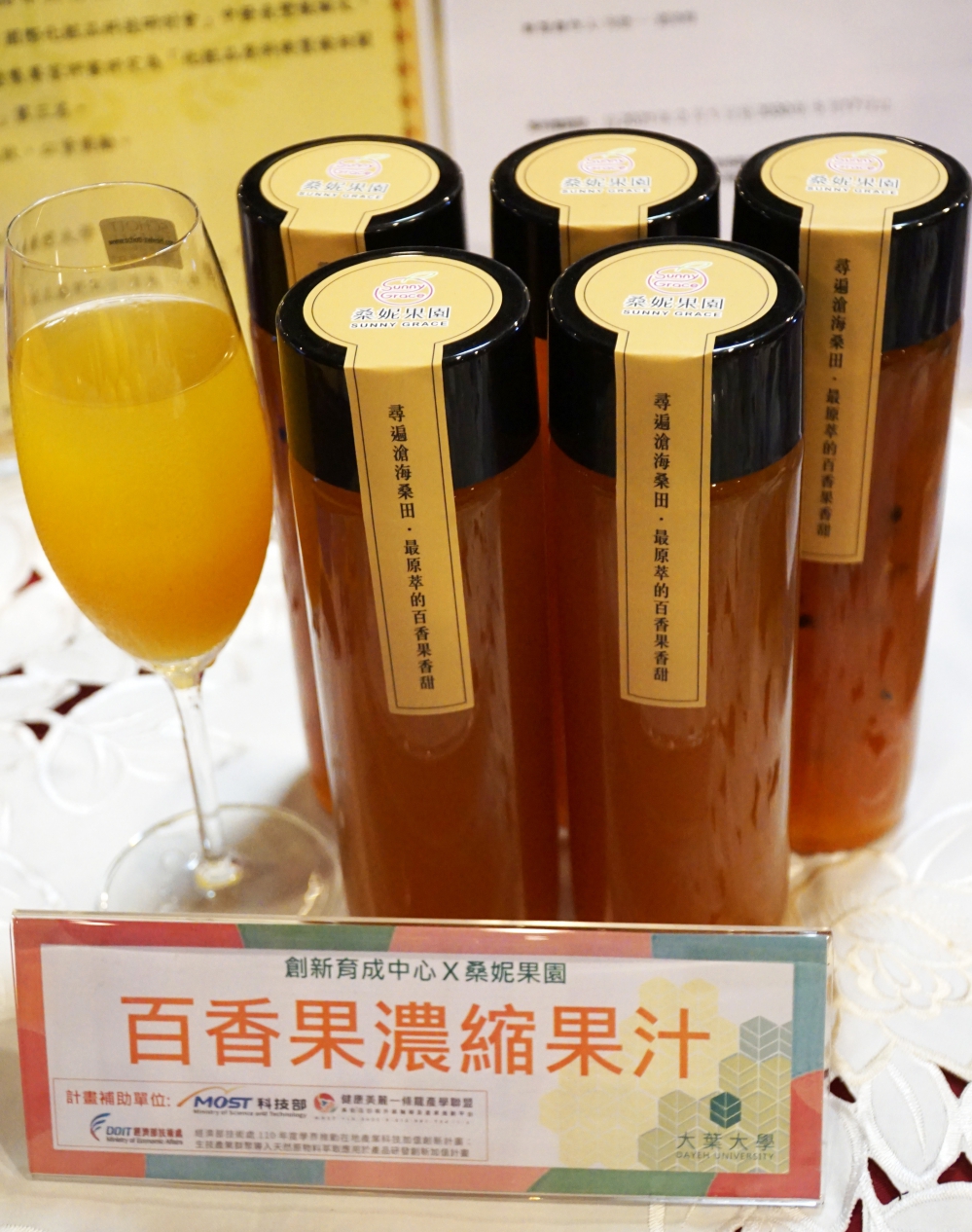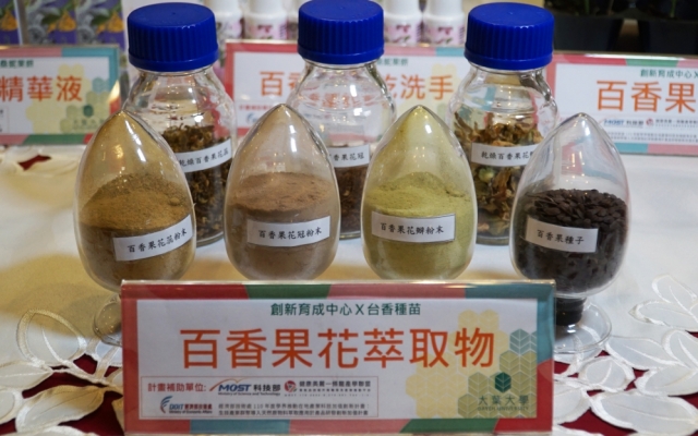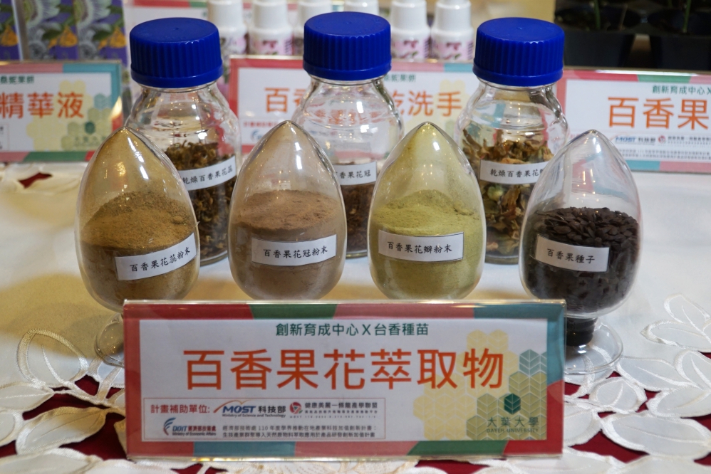 大葉大學創新育成、生技中心,與﹁台香種苗」產學合作,萃取百香果花朵,研發全國唯一的﹁百香果花美粧品﹂和﹁果汁、果凍﹂等百香果附加價值。