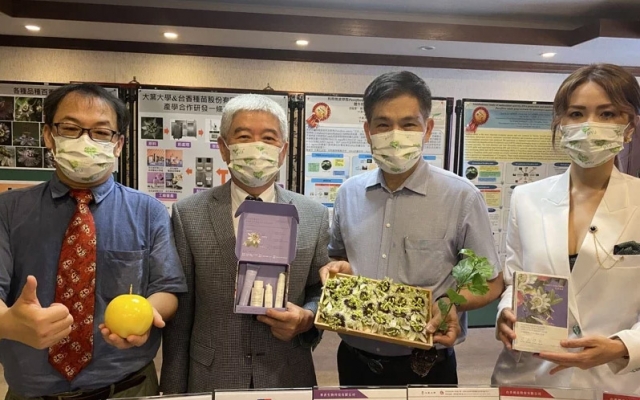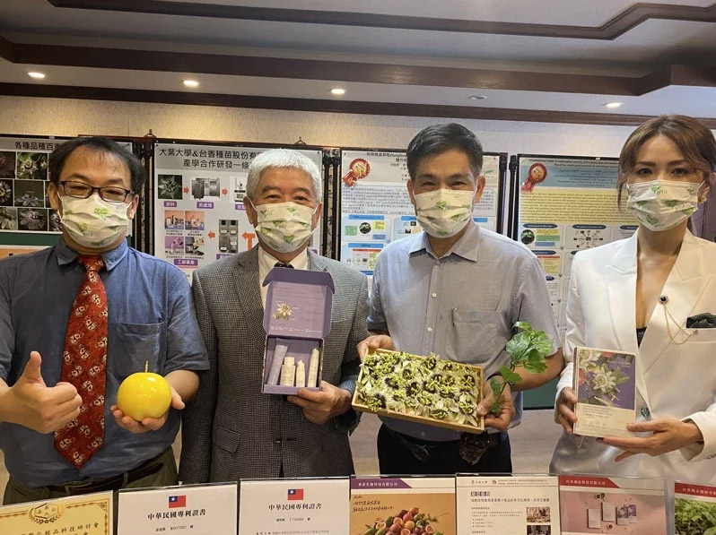 台香種苗總經理劉千臺說,台香與大葉大學產學合作成果豐碩,先後獲頒國際化粧品科技研討會暨技術交流展示會論文第三名、化粧品技術創新研討會壁報論文第三名、火炬國際化獎等獎項肯定,並取得百香果花萃取物在面膜美白的新型專利,及製備百香果花萃取物的發明專利。