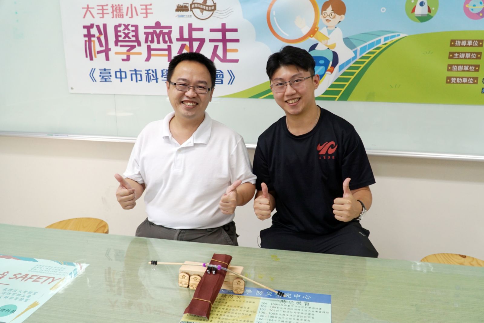 消防學程助理教授周中祺指出,曬科學市集是今年「大手攜小手,科學齊步走-台中市科學博覽會」計畫的最後一場活動,透過師生共同設計的「夾子機器人」、「漂浮風火輪」教案,引導小朋友認識科學知識,同時連結到環境教育,利用減少摩擦力等科學原理來減少損耗,達到節能目標。
