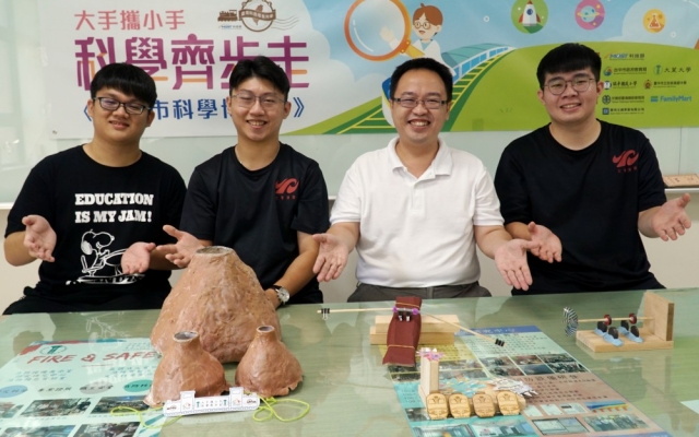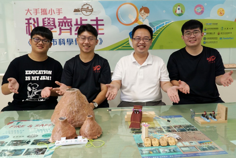 消防學程助理教授周中祺指出,曬科學市集是今年「大手攜小手,科學齊步走-台中市科學博覽會」計畫的最後一場活動,透過師生共同設計的「夾子機器人」、「漂浮風火輪」教案,引導小朋友認識科學知識,同時連結到環境教育,利用減少摩擦力等科學原理來減少損耗,達到節能目標。