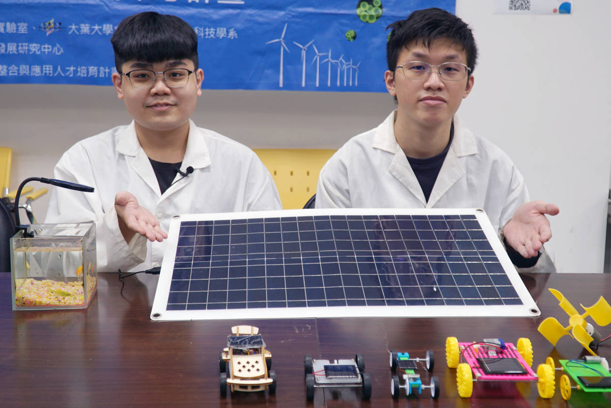 食生系碩士生詹哲嘉說,實驗室有太陽能、燃料電池等綠能研究成果,現代人喜歡養魚,觀賞魚需要光源,他們利用太陽能提供電力,供應水族箱照明。大四生楊承諭則說,實驗室準備了「電精靈寶寶」體驗活動,讓民眾運用海藻酸鈉、氯化鈣等材料製作燃料電池中的固定化微生物顆粒。