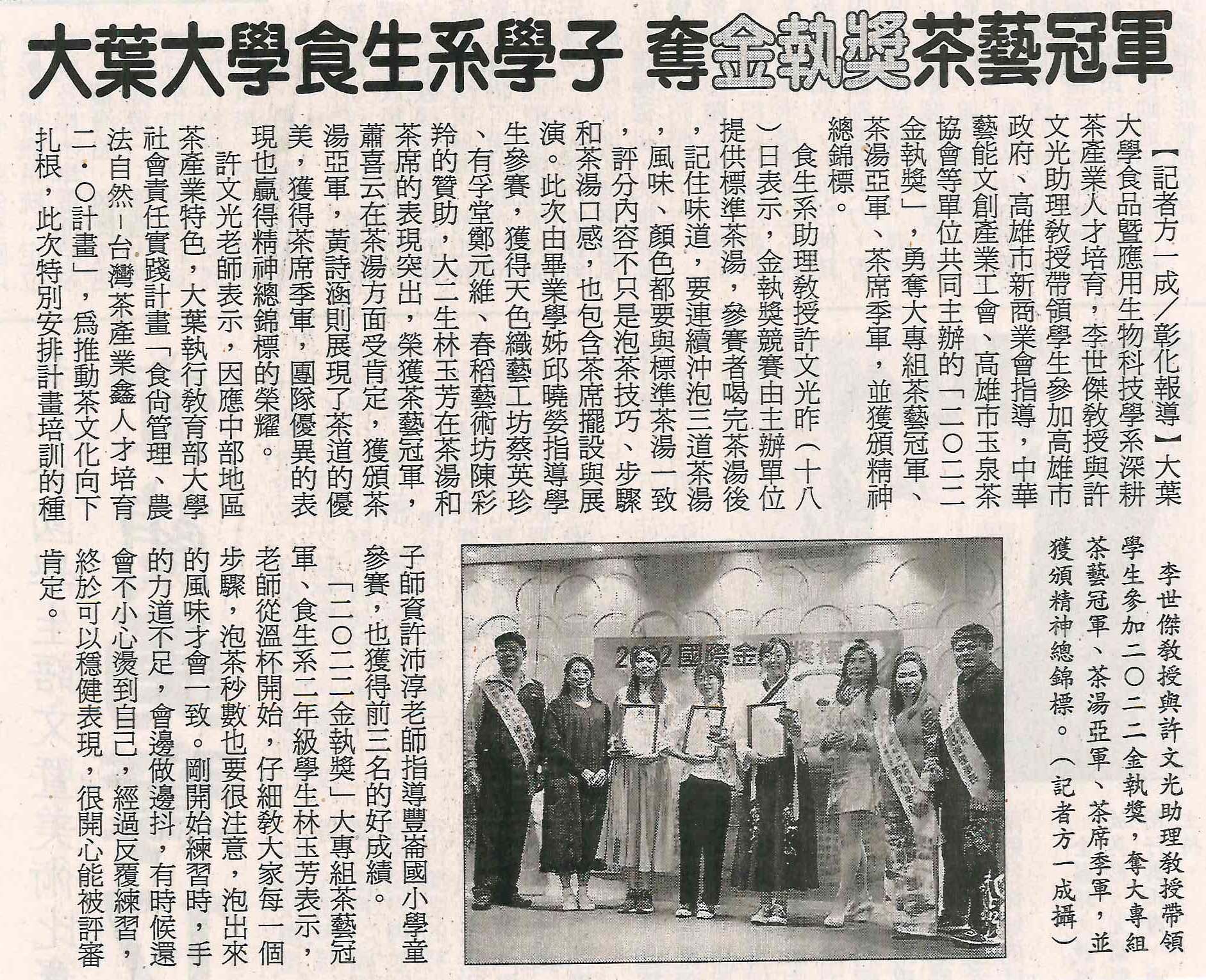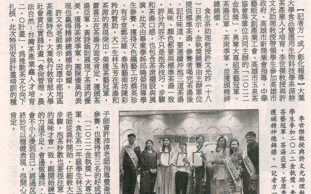 上一則:2022金執獎 大葉大學食生系勇奪茶藝冠軍