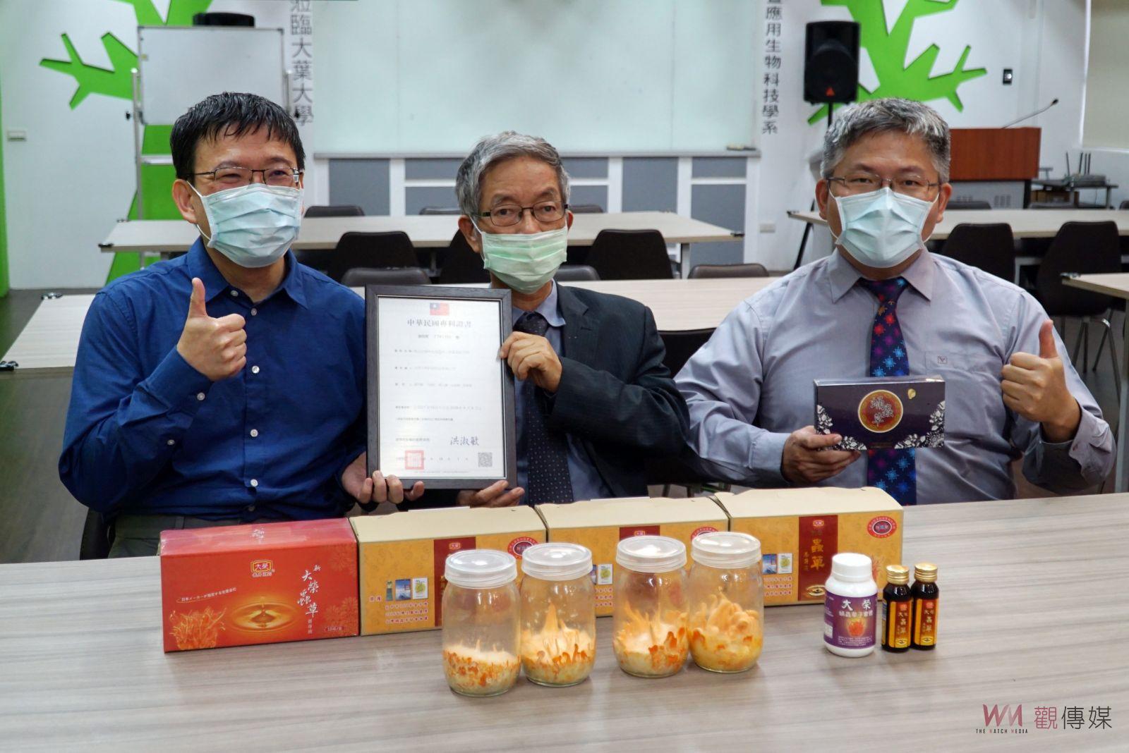 蛹蟲草,又名黃金草,是一種寄生於鱗翅目幼蟲體內生長的真菌,大葉大學食生系協助大榮生技驗證蛹蟲草的保健功效,研究團隊經實驗室測試證實蛹蟲草子實體膠囊對小鼠呼吸道的保護效果,成果並取得「用以改善呼吸道疾病之蛹蟲草組合物」發明專利。