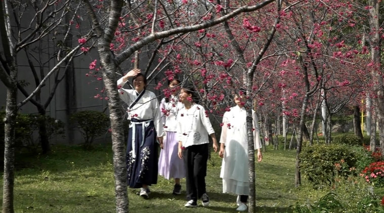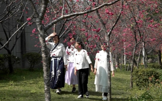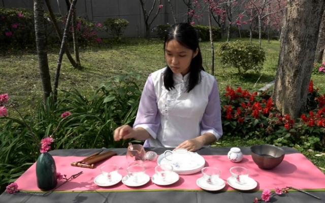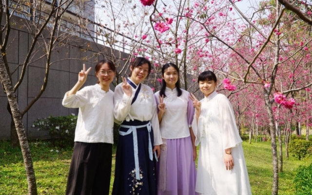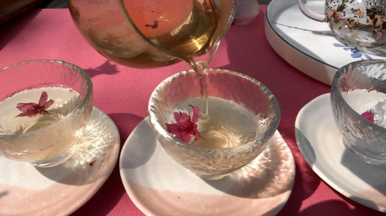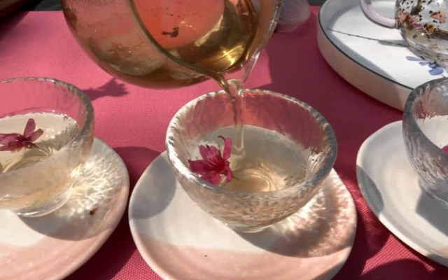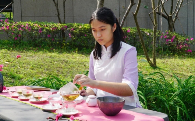 食生系大二生王嘉儀說,系上課程教導大家認識茶藝與茶文化,學習如何泡茶、擺茶席,適逢學校櫻花綻放,在系上老師帶領下,大家在櫻花樹下,運用櫻花元素布置茶席、泡櫻花玫瑰茶,欣賞櫻花美景,超有fu。
