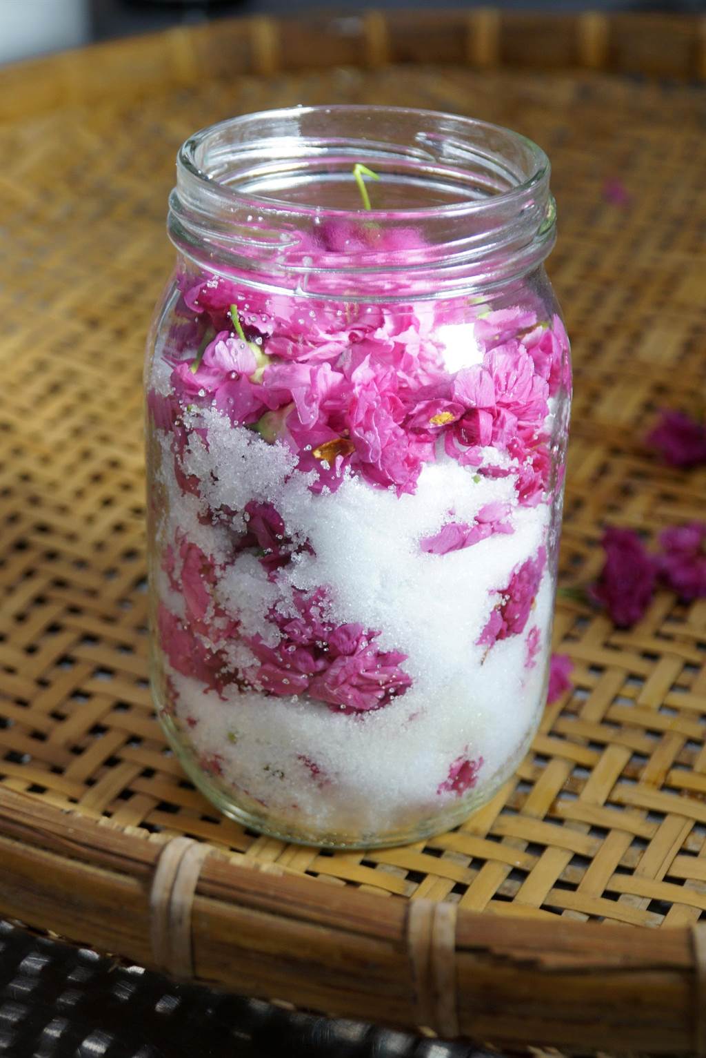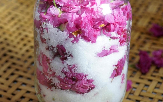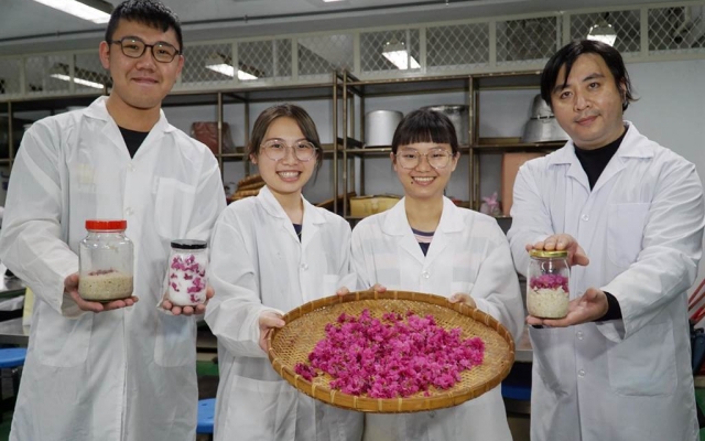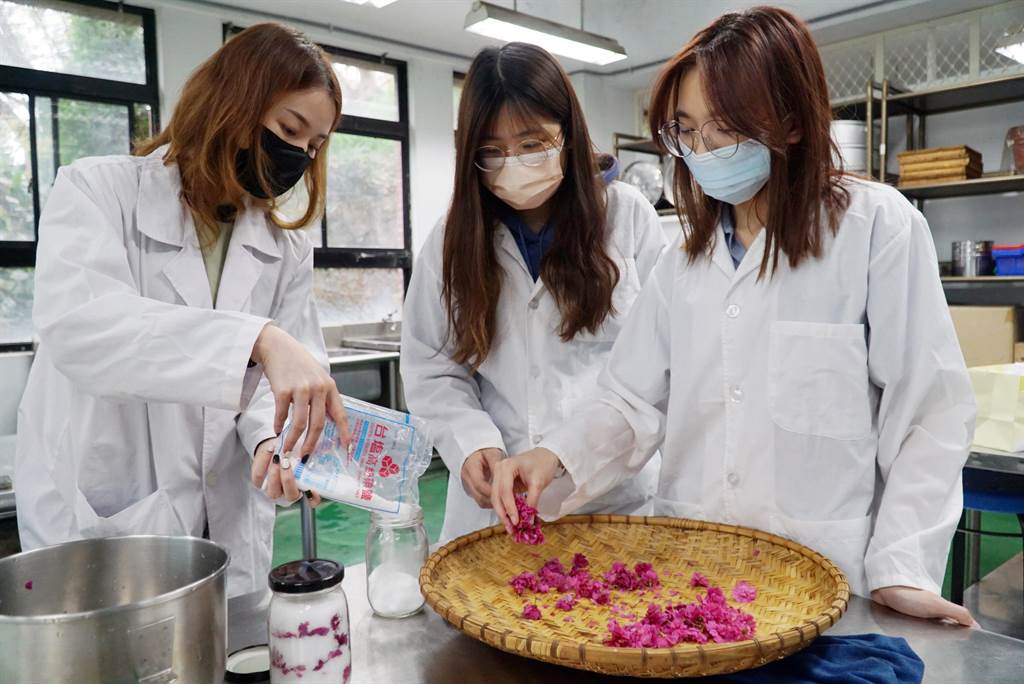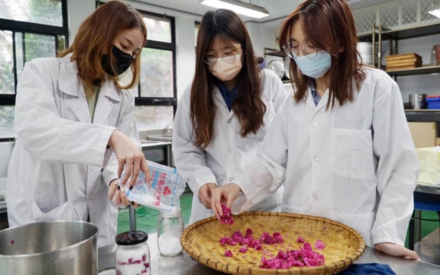 許文光說,日本社會飲食文化中,也常見以櫻花來做花茶、甜點。適逢校園內櫻花季來臨,「酒類釀造及實習」課程特別結合藥用植物與食品加工2大面向,教學生製作鹽漬櫻花、櫻花甜酒釀。