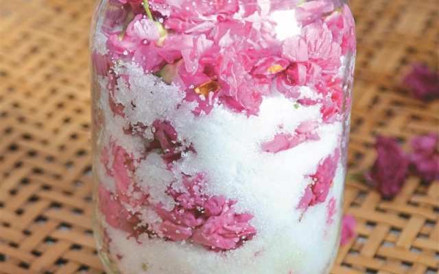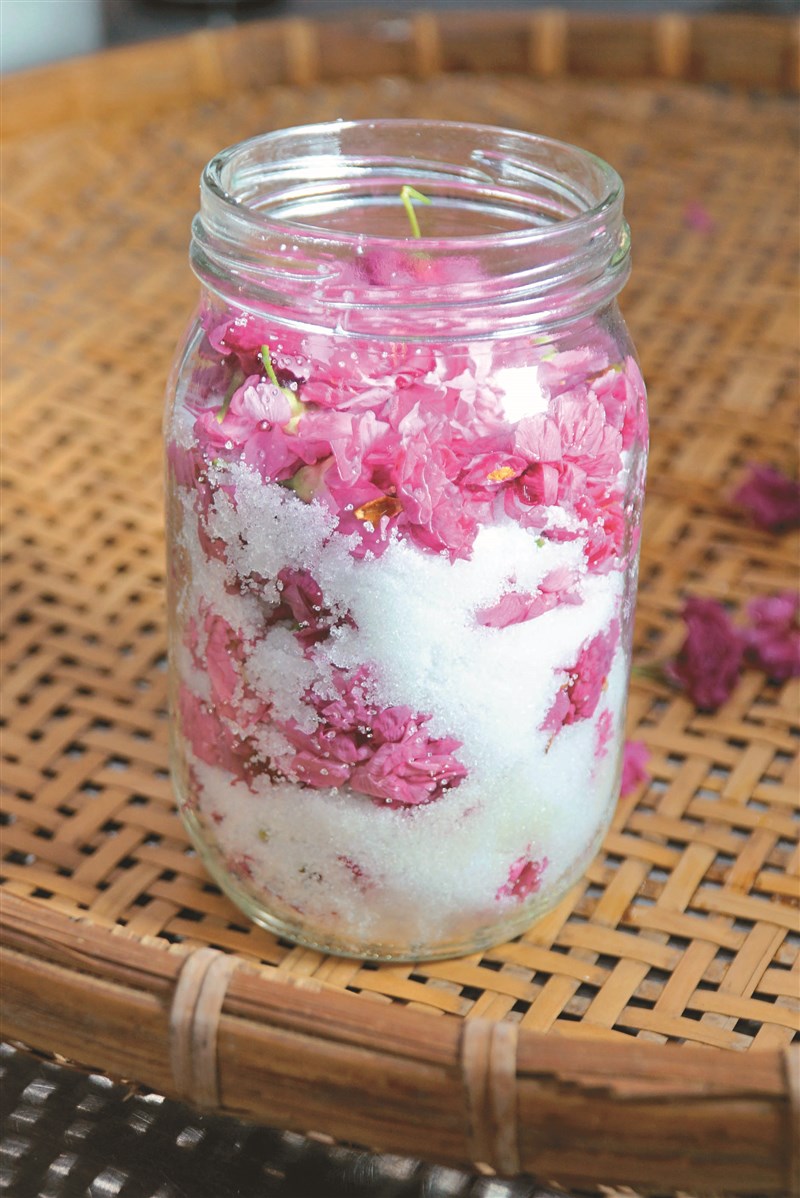食生系大四生蘇芷宣分享,鹽漬櫻花的作法是先將櫻花洗淨、瀝乾,一層鹽、一層花放入玻璃瓶中,密封後放置一周,就可以當烘焙點心的材料,可增添餅乾、果凍的風味。