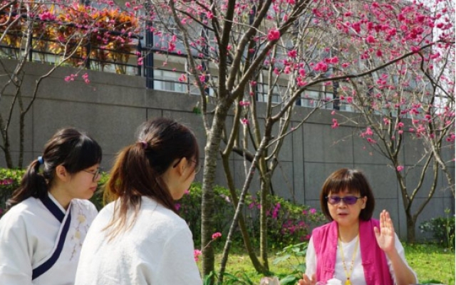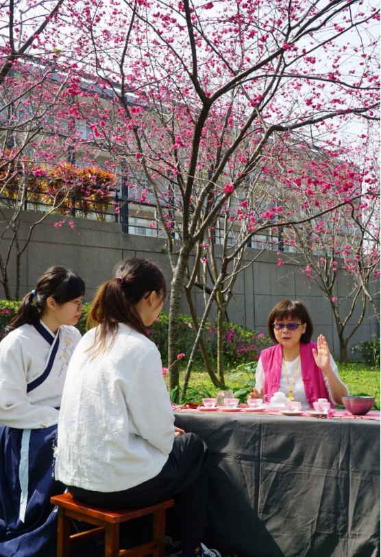 大葉大學座落於參山國家風景區境內,長期致力營造綠色校園,不僅綠意盎然,也遍植各種可觀賞花卉,近日隨著氣溫回暖,校園裡的櫻花陸續綻放,粉紅花朵隨風搖曳,美不勝收,成為大員林地區賞櫻秘境,有的學生還在櫻花樹下擺茶席,感受春日風情。