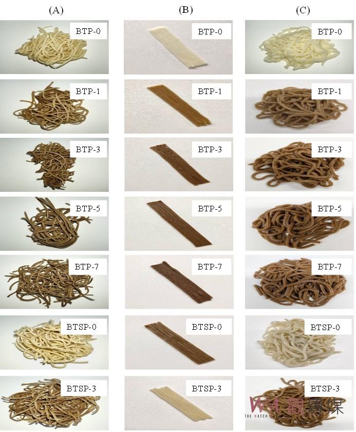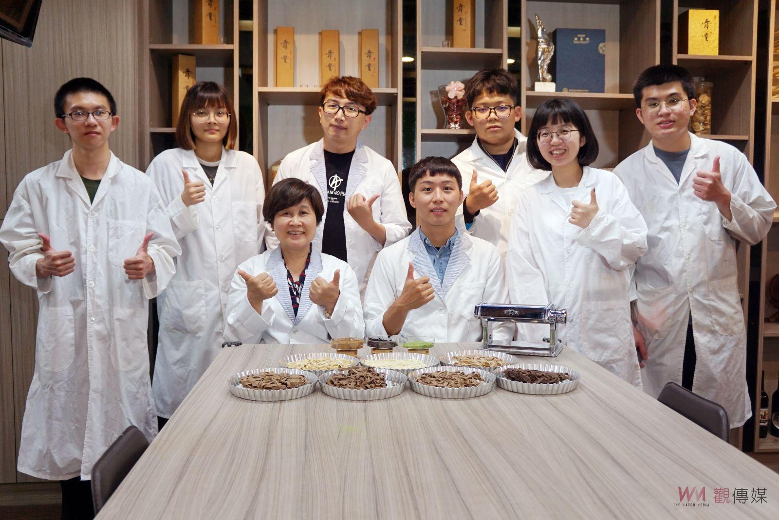 食生系教授宋祖瑩指導他先探討原料特性,實驗確認植物萃取物具備降血糖潛力後,緊接著開發麵條,一方面測試不同配方的GI值,另一方面針對口感、風味、質地進行官能品評,選出兼具健康和美味的麵條配方。