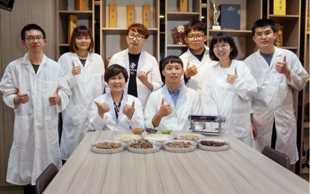 以低GI麵條研究取得大葉大學食生系碩士學位的李陳薳指出,他大學曾到速食麵廠實習,除了觀摩到大型食品製造廠的生產與管理,也在實習過程發現自己對食品加工特別感興趣,促使他繼續攻讀研究所,並選擇低GI麵條為研究對象。環境永續是全球趨勢,過去薑葉屬於農業廢棄物,但已有資料發現薑葉有抗癌、抗發炎、降血脂的作用,台灣用於包裹米食的月桃葉,以及健康取向的茶葉,同樣擁有抗氧化等特性,因此他在麵條中加入薑葉、月桃葉、茶葉等植物性原料。在宋祖瑩老師的指導下,他先探討原料特性,實驗確認植物萃取物具備降血糖潛力後,緊接著開發麵條,一方面測試不同配方的GI值,另一方面針對口感、風味、質地進行官能品評,選出兼具健康和美味的麵條配方。