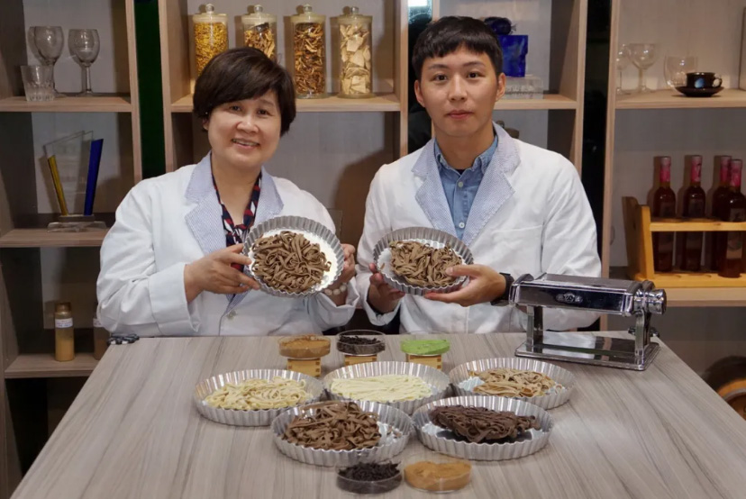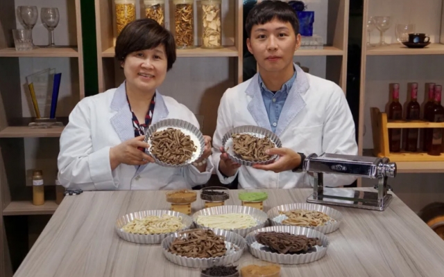 很多人喜歡吃麵,但又會擔心食用後血糖上升問題,大葉大學食品暨應用生物科技學系教授宋祖瑩指導研究生李陳薳開發低GI麵條,在中筋麵粉中加入薑葉、月桃葉、茶葉等植物配方,成功研發出低升糖指數的健康麵條,相關技術專利申請中。