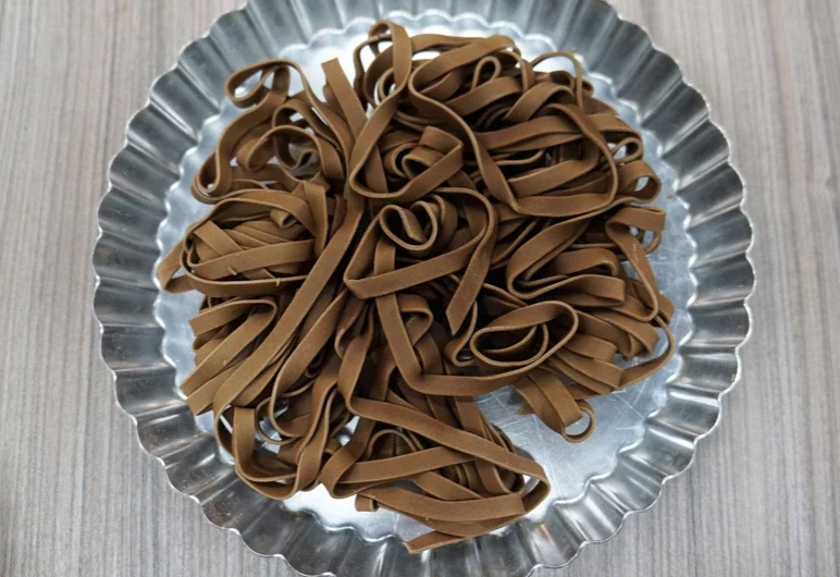 在宋祖瑩老師的指導下,李陳薳先研究原料特性,實驗確認植物萃取物具備降血糖潛力後,接著開發麵條,一方面測試不同配方的GI值,一方面針對口感、風味、質地進行官能品評,選出兼具健康和美味的麵條配方。