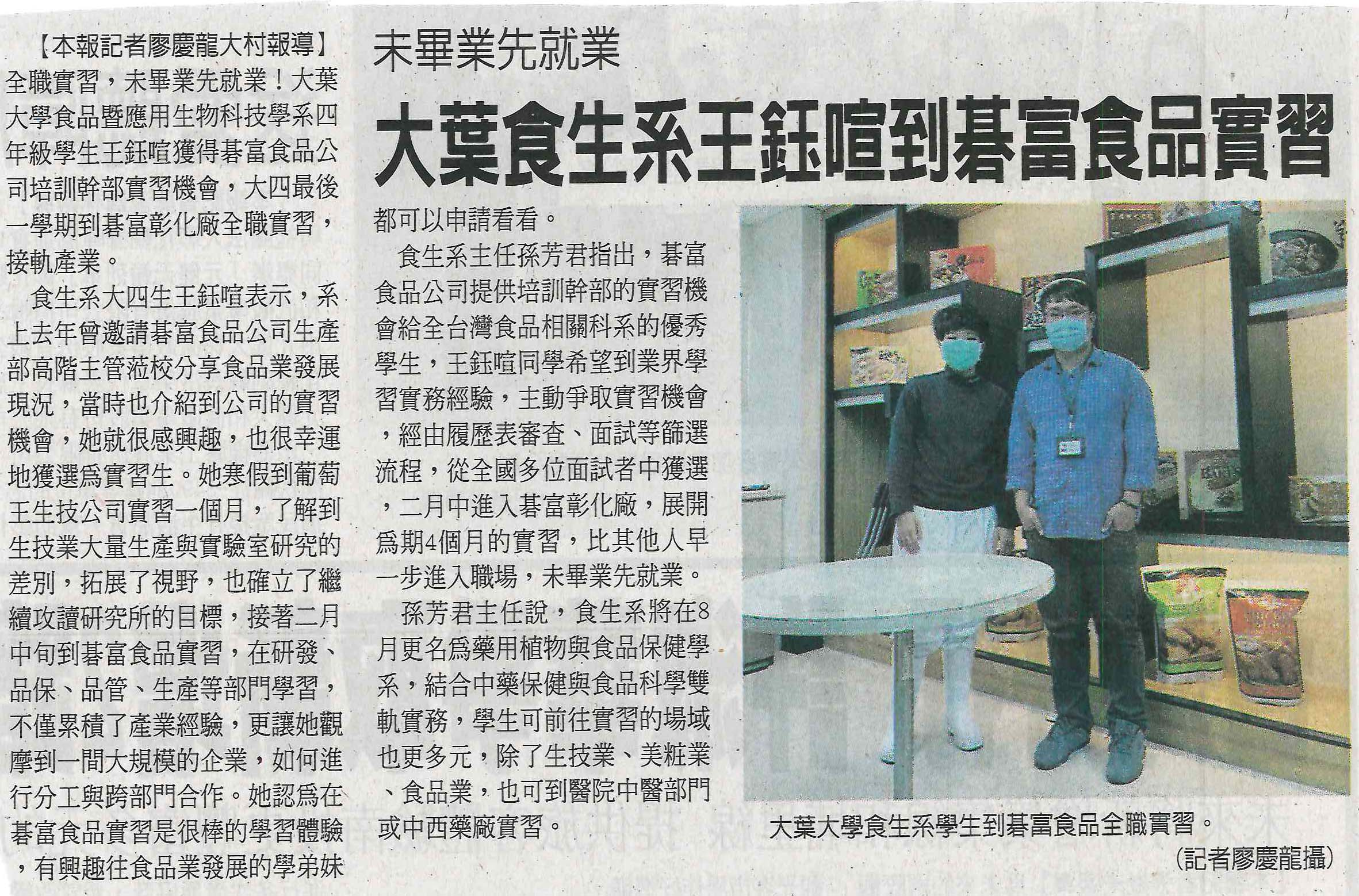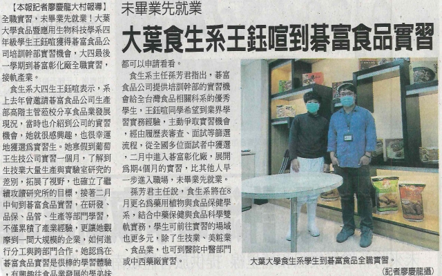 大葉食生系王鈺喧到碁富食品實習