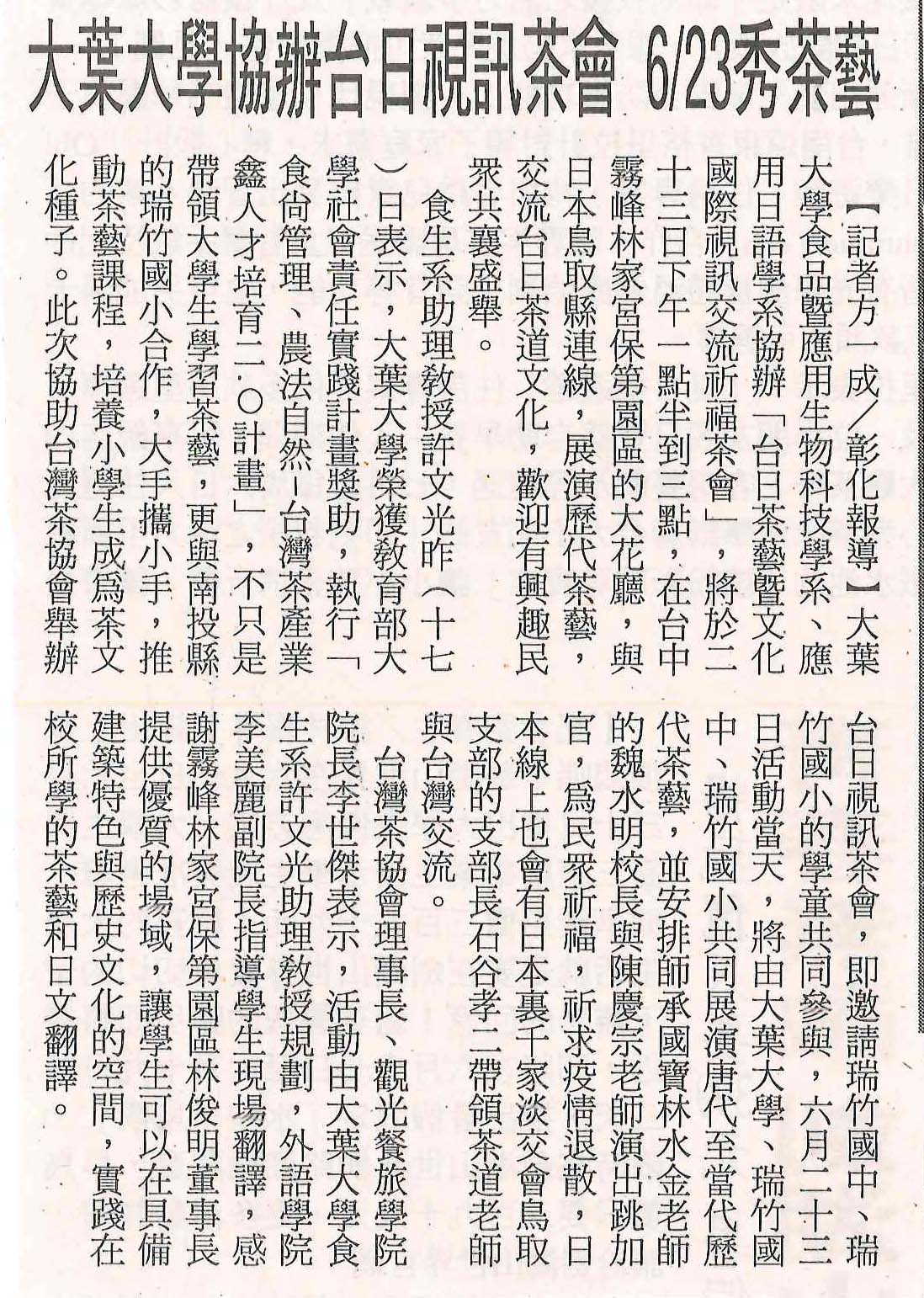 大葉大學協辦台日視訊茶會 6/23秀茶藝